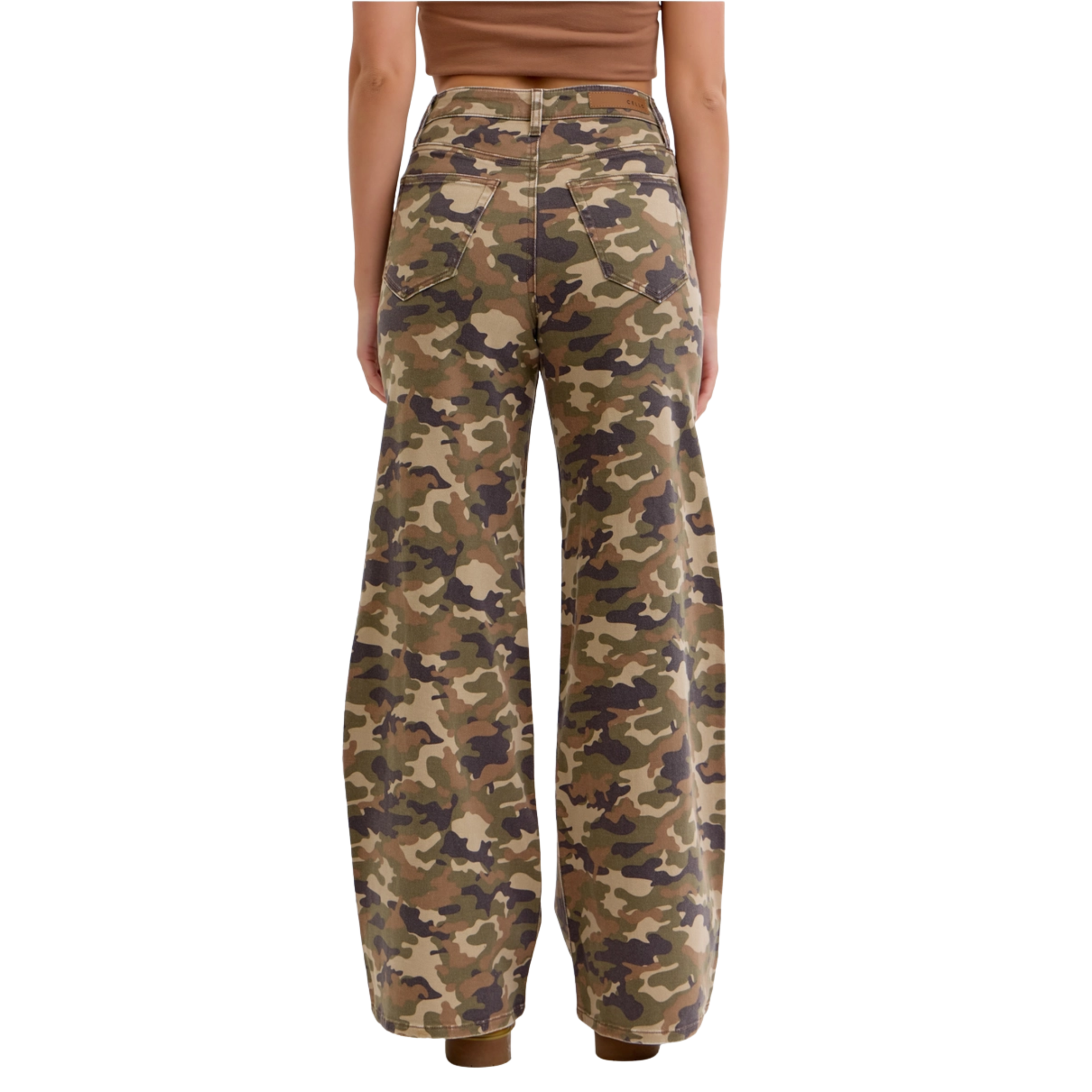 These jeans are a bold camo statement piece designed with a flattering high waist and a wide-leg silhouette. The classic camouflage print in earthy greens, browns, and neutrals gives them an edgy, utilitarian feel, while the relaxed cut keeps them comfortable and versatile. Perfect for pairing with simple tanks or chunky sweaters, these jeans bring a modern twist to rugged, off-duty style.