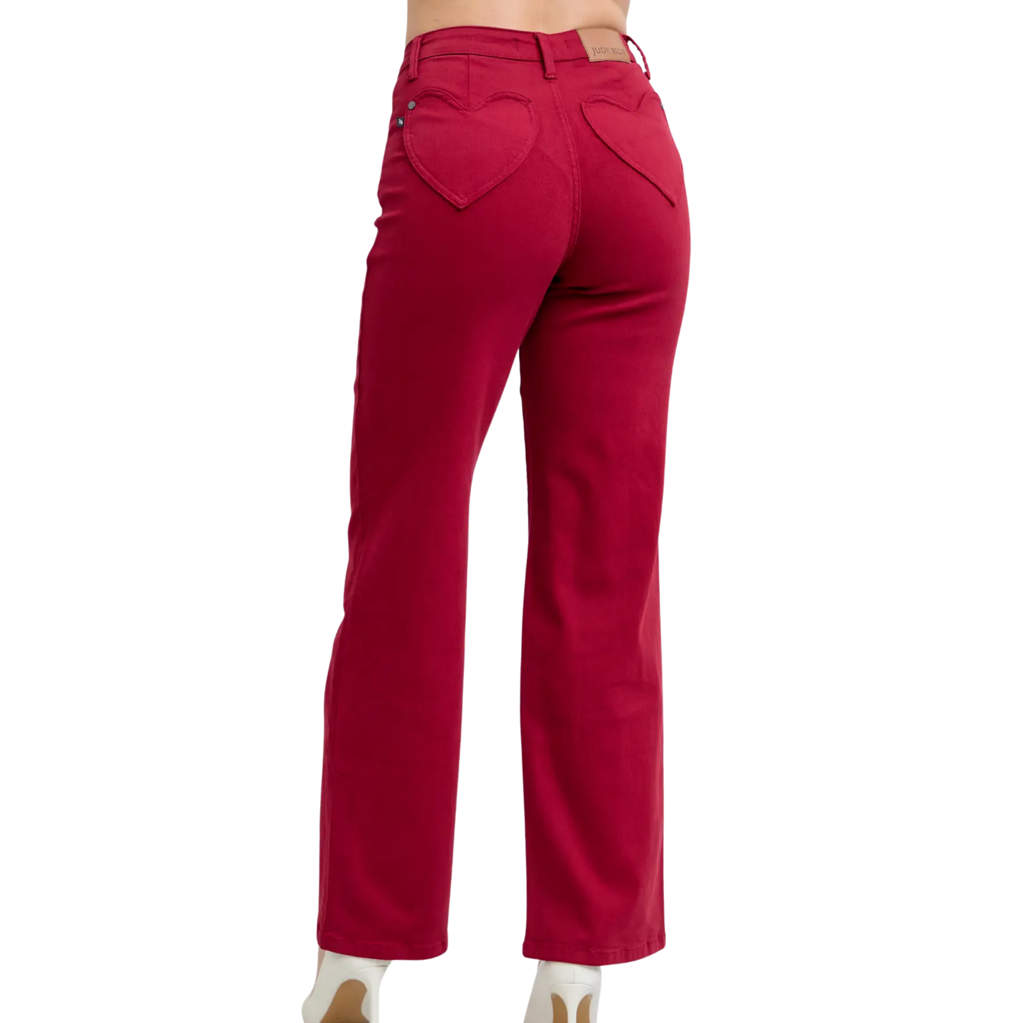 These pants make a bold and confident statement with their rich cranberry-red hue and sleek silhouette. Designed with a flattering high-rise waist and structured straight leg, they elongate the figure while maintaining a polished, modern feel. The subtle heart-shaped back pockets add a playful feminine touch, and the soft yet durable fabric ensures all-day comfort. Perfect for pairing with a tucked-in blouse and heels for a chic night out, or with a cozy sweater and boots for a festive daytime look.
