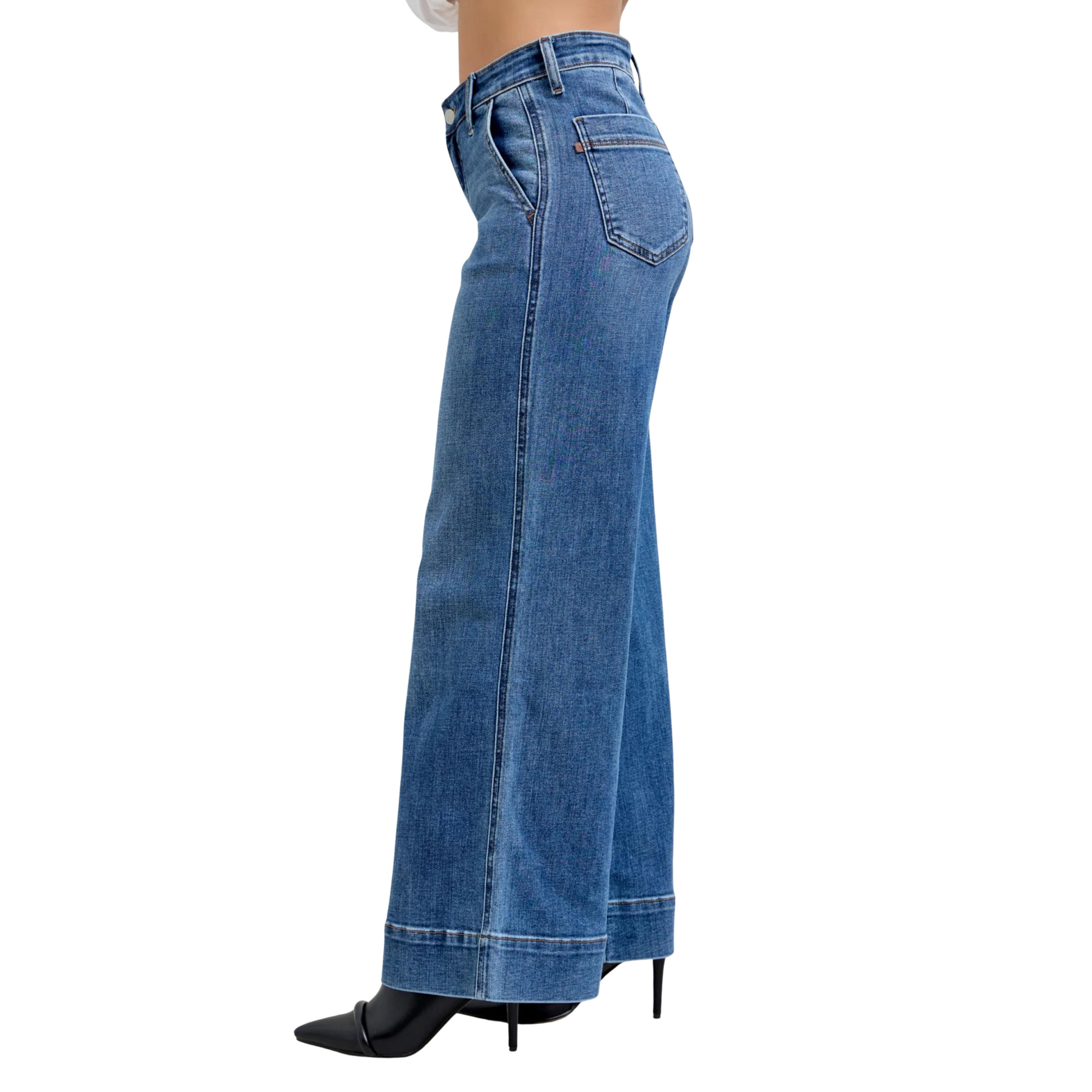 These chic wide-leg jeans give you that sleek, put-together look while still feeling relaxed and wearable. The rich blue wash keeps them classic, while the stitched hem detail at the bottom adds a subtle boutique twist that elevates them beyond your everyday denim. Pair them with a crisp button-down, fitted knit, or silky blouse for a look that goes from office chic to dinner-date ready.
