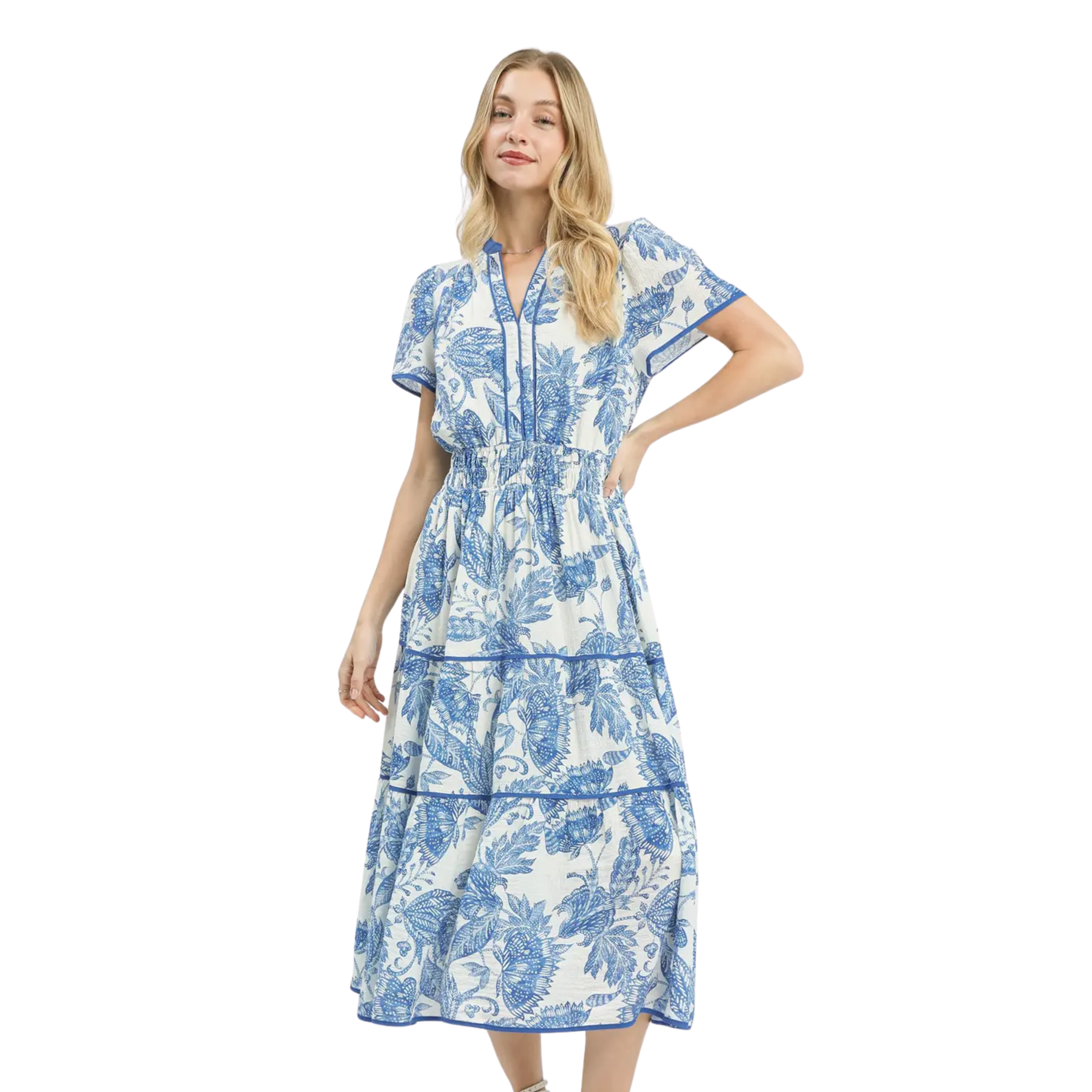 Effortlessly elegant with a fresh, coastal feel, the Blue Botanical Midi Dress is a timeless staple for spring and summer. Designed in a crisp ivory base with intricate blue botanical prints, this dress features a flattering split neckline, short sleeves, and a softly smocked waist that defines your shape while keeping things comfortable. The tiered midi skirt adds graceful movement, making it perfect for brunch, showers, vacations, or everyday wear. Light, airy, and endlessly versatile—this is one of those dresses you’ll reach for again and again.