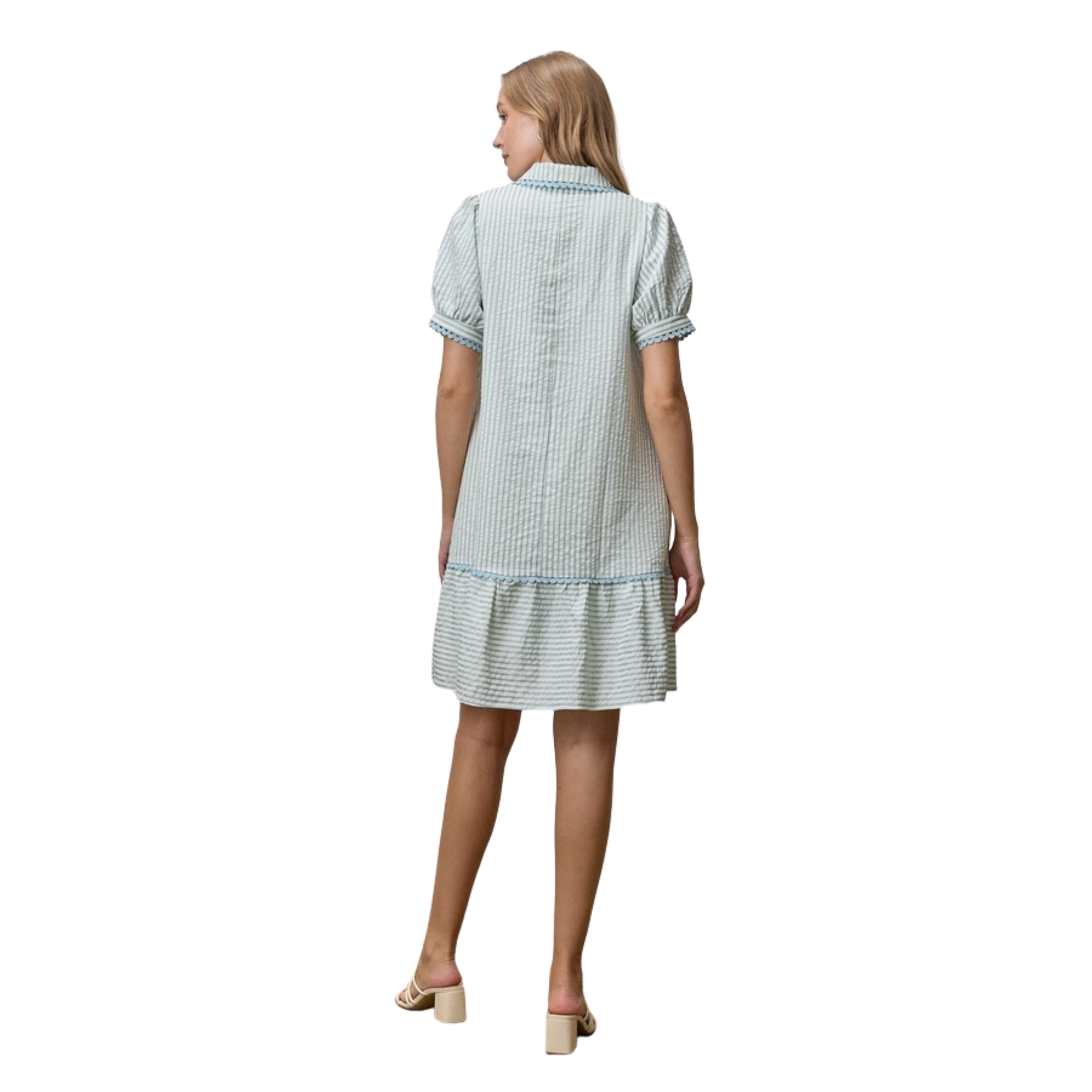 A relaxed blue pinstripe dress featuring puff sleeves and a collar trimmed in beautiful blue lace. Lightweight and timeless, it’s a piece designed for effortless everyday elegance.