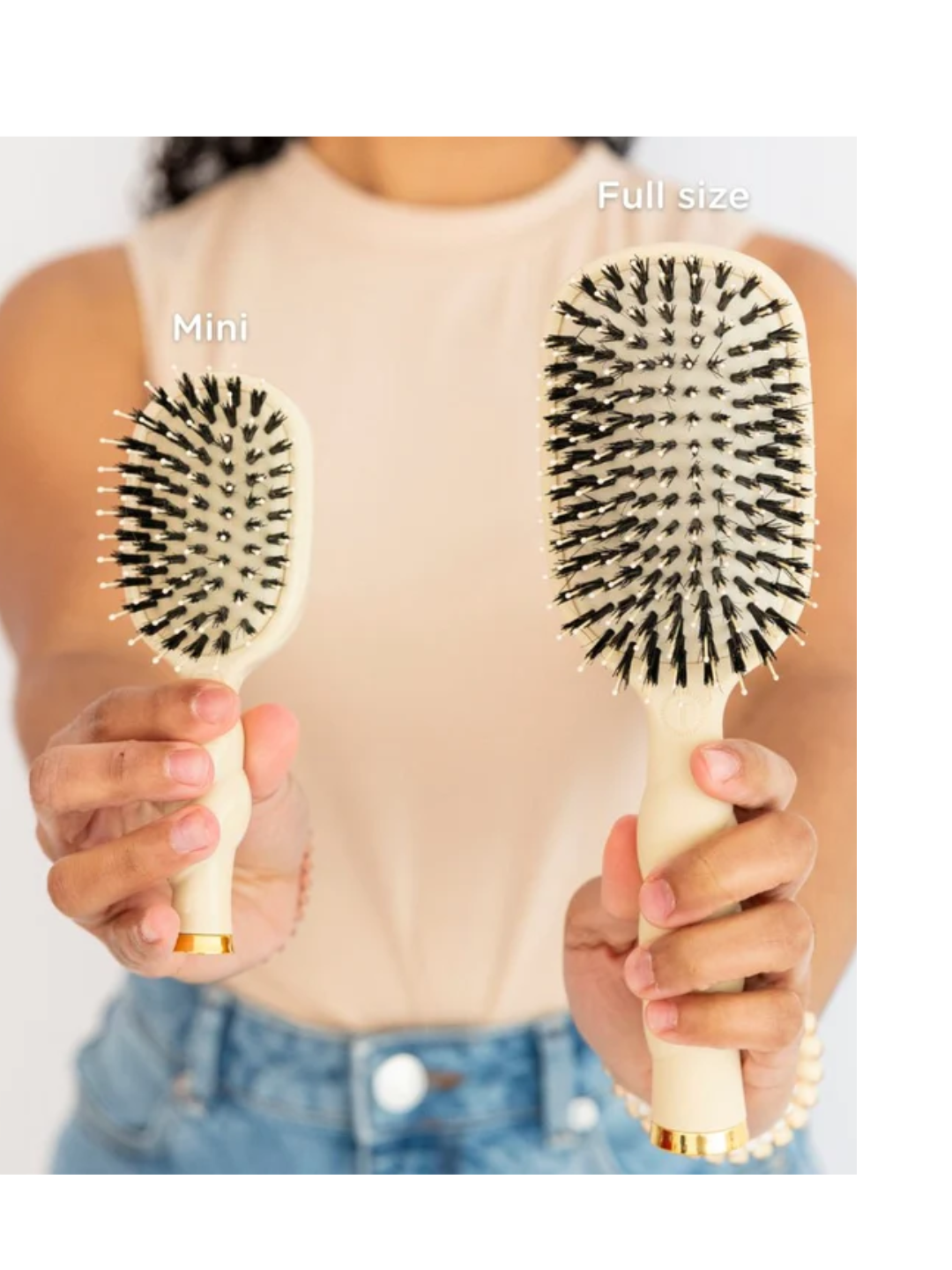 The Mini Boar Bristle Hair Brush in Tan is your go-to for smooth, polished touch-ups on-the-go. Natural bristles help reduce frizz and boost shine by distributing oils from root to tip, making it a perfect mini hair brush for travel and everyday styling.