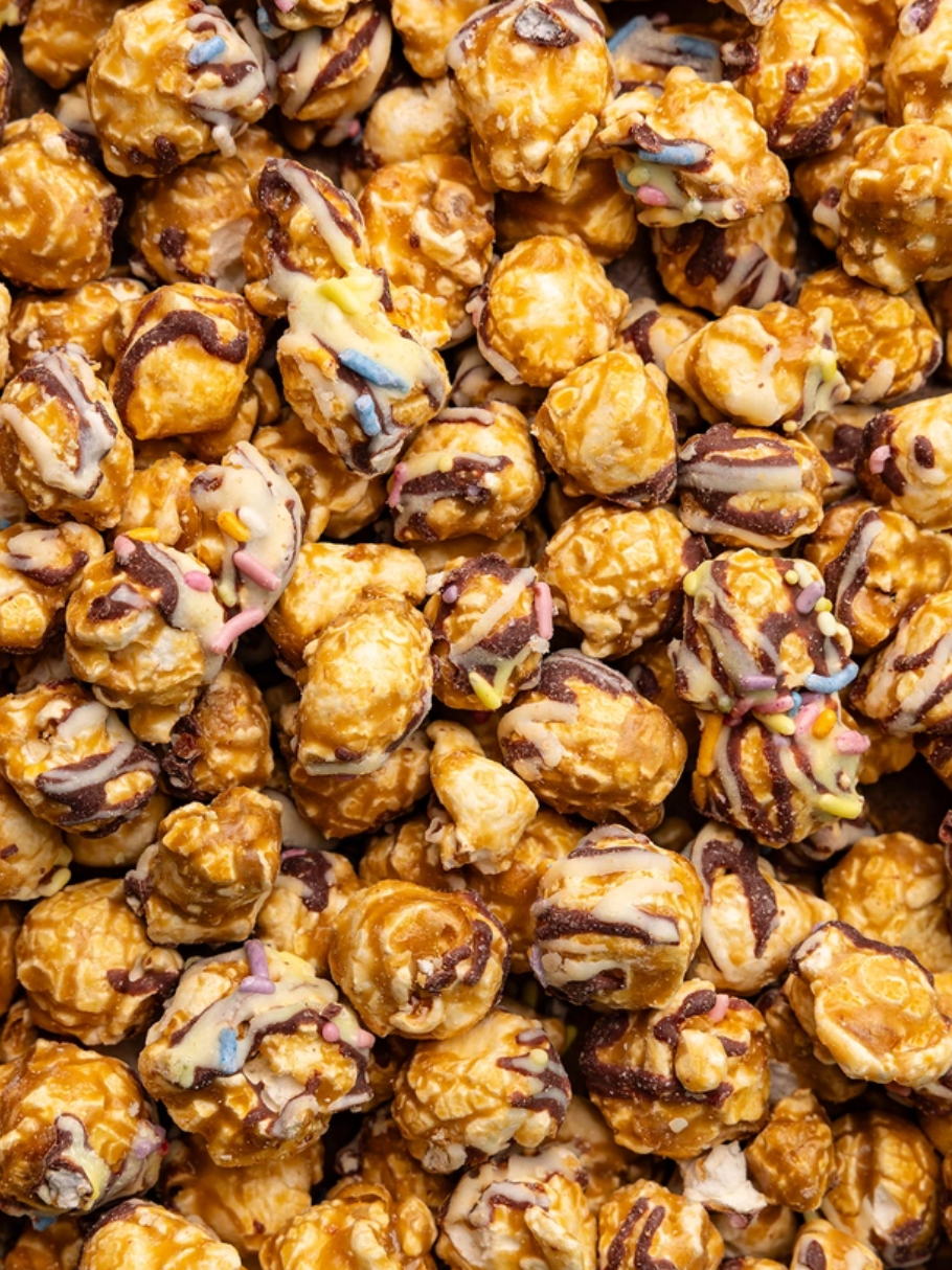 A birthday-ready Salted Caramel popcorn topped with white and dark chocolatey drizzle and festive sprinkles. Sweet, crunchy, and ready to party.