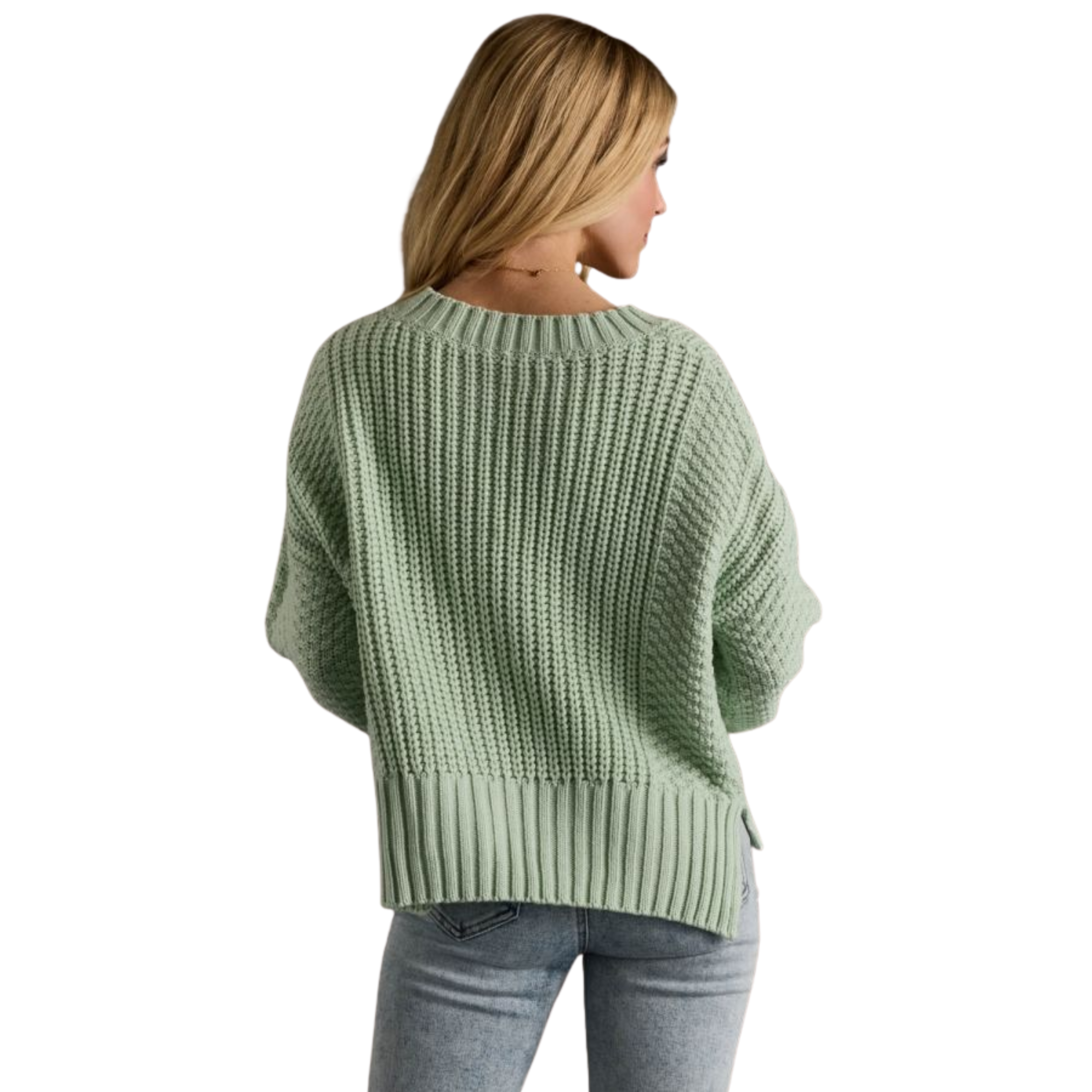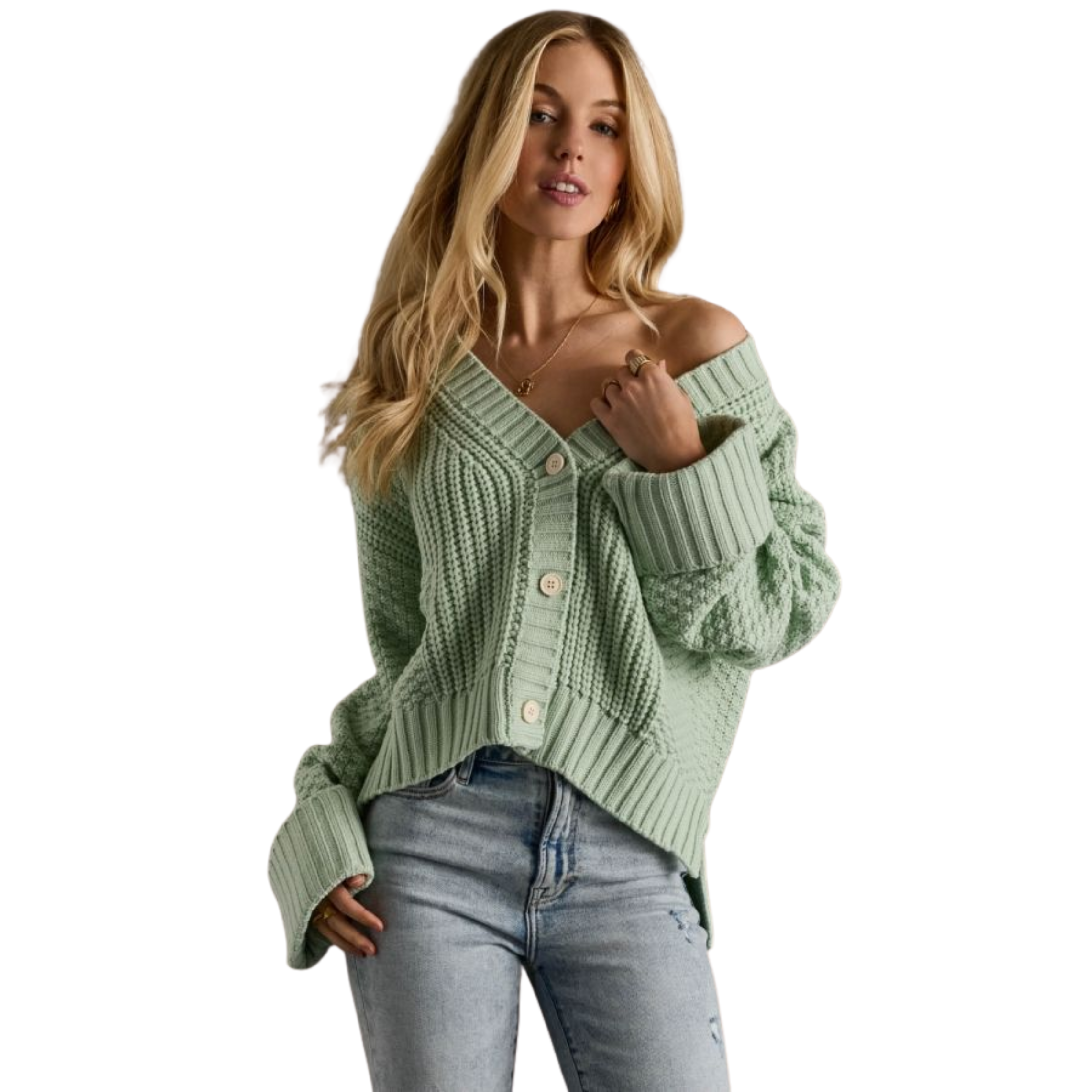 Soft, fresh, and perfectly on-trend, the Mint Harbor Buttoned Cardigan adds a light, airy pop of color to your everyday layers. Featuring a creamy mint knit with beautifully mixed ribbed textures, this cardigan is designed with a flattering V-neckline, classic button-front closure, and relaxed sleeves finished with extra-long cuffs for that effortless boutique feel. The slightly cropped, easy silhouette pairs seamlessly with high-rise denim or layered over a simple tank for a polished yet cozy look. A fresh neutral you’ll wear on repeat, season after season.