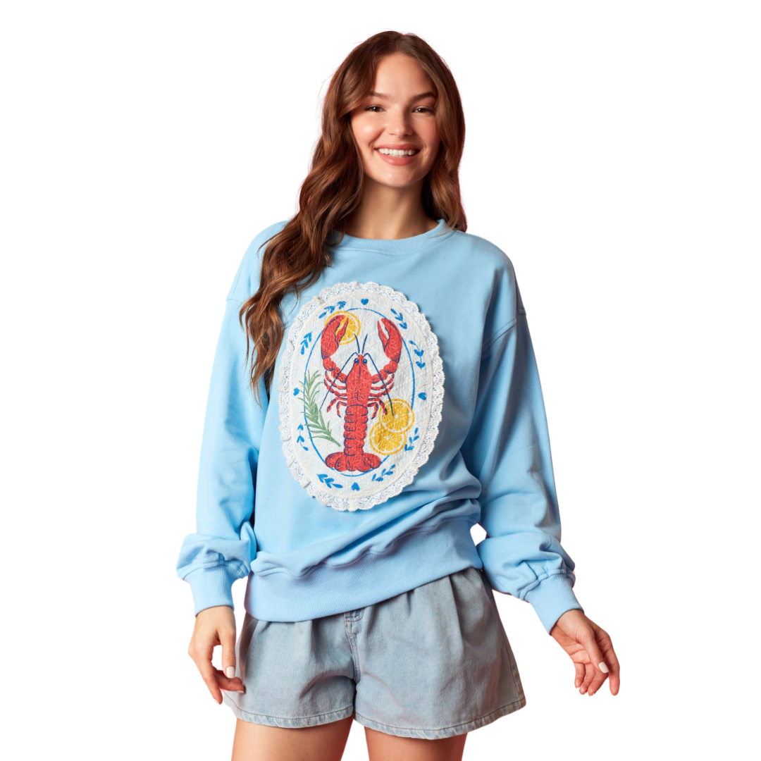 A little playful, a little coastal-chic The Coastal Lobster Sweatshirt is a soft, sky-blue pullover featuring a charming embroidered lobster framed in a vintage-inspired lace oval with lemon and floral details. The whimsical artwork gives it that nostalgic, European-market feel while still feeling fresh and fun.