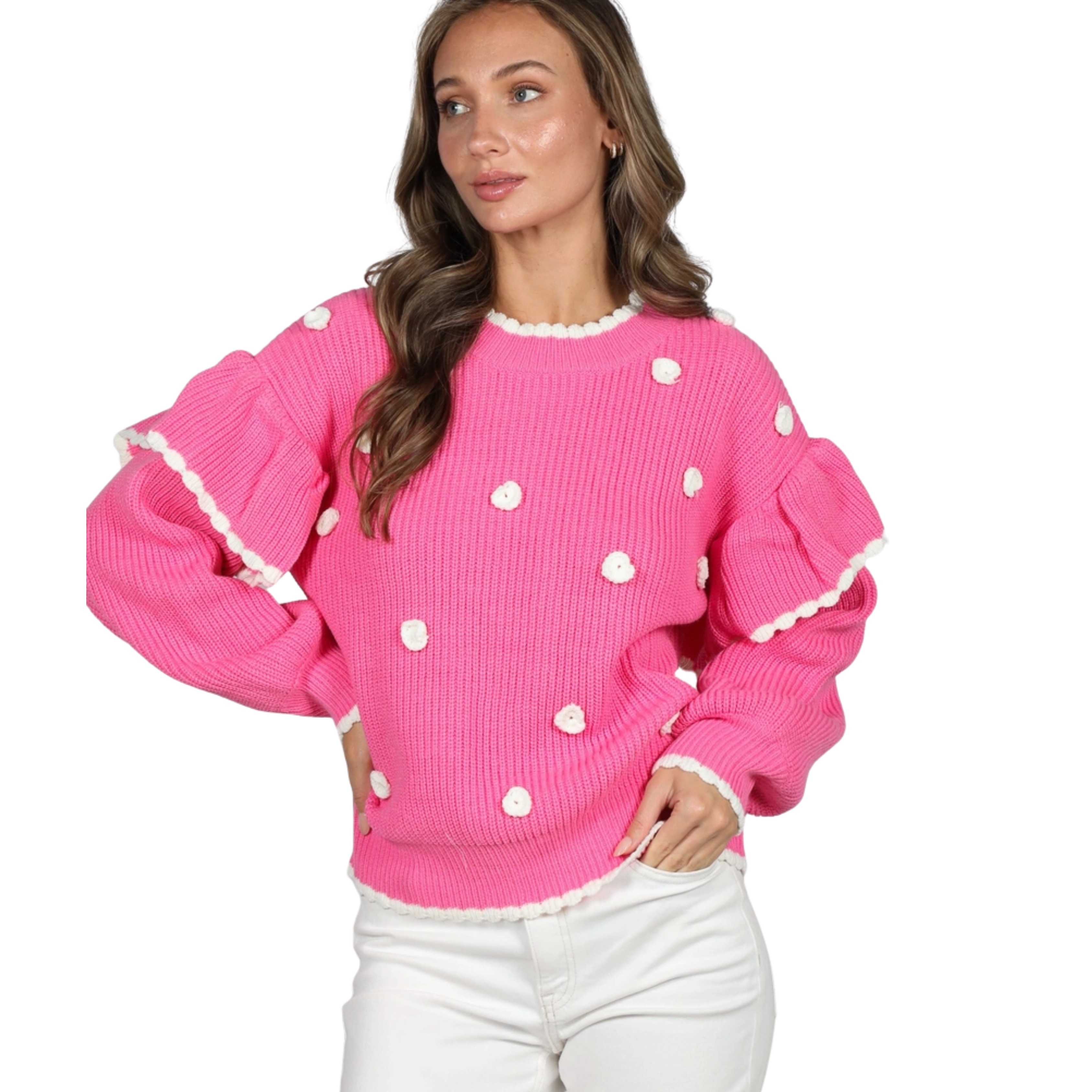 Meet your new Valentine-ready favorite 💕 The Heartbreaker in Pink Sweater is a dreamy hot-pink knit sprinkled with the sweetest white details for a playful, couture-inspired look. Featuring romantic ruffle sleeves trimmed in scalloped ivory, this sweater gives major LoveShackFancy-meets-Parisian-chic energy. The soft, cozy knit drapes beautifully while the statement sleeves add that extra boutique drama we love. Perfect with crisp white denim, skirts, or layered over a collared blouse for that elevated, feminine finish.
