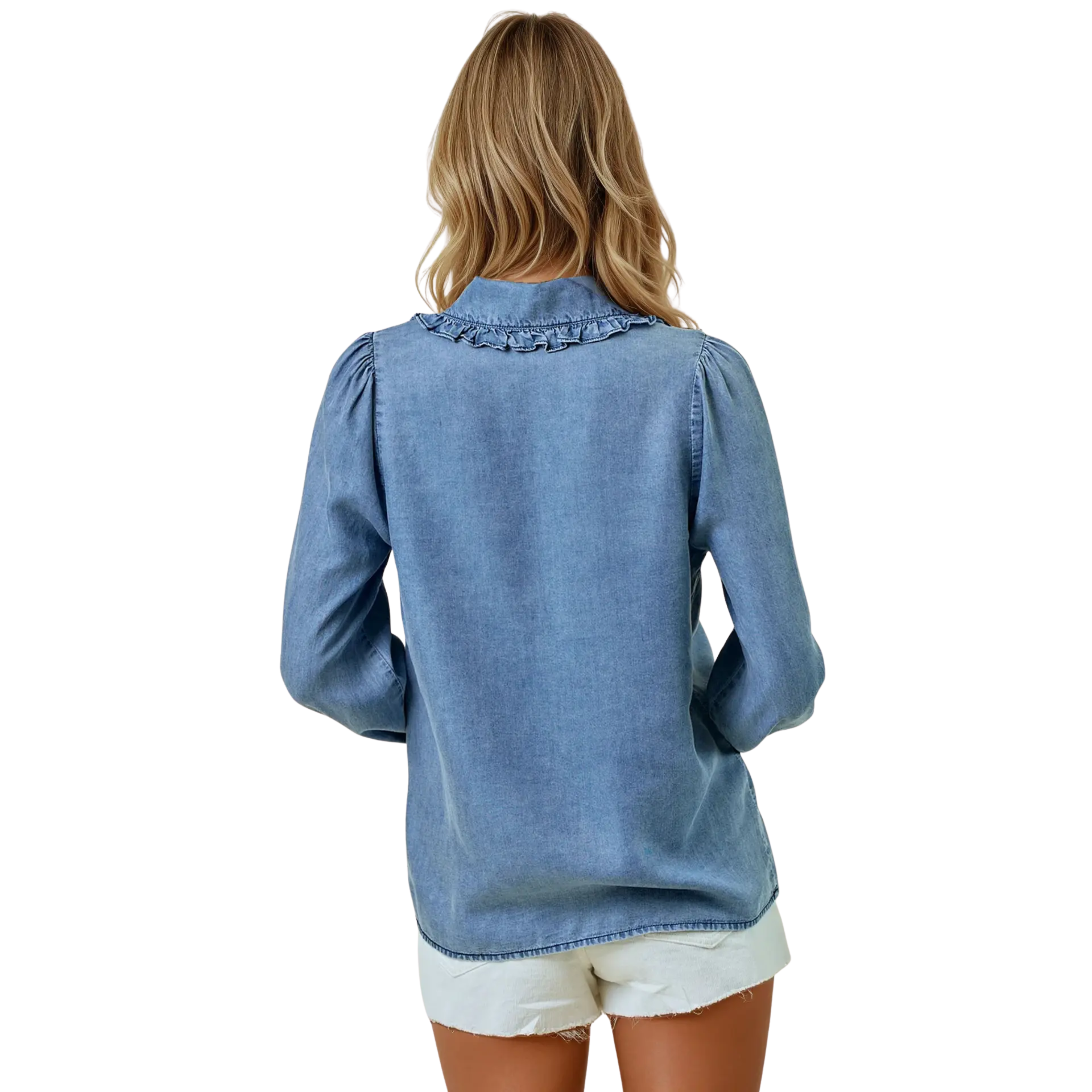 Meet your new go-to for charm-with-ease: The Sweet Carolina Denim Blouse. Soft, lightweight denim meets a darling ruffled Peter Pan collar for that perfect blend of Southern sweetness and modern polish. With its relaxed fit, button-front detailing, and subtly gathered sleeves, this top elevates even the simplest outfit — from white denim shorts to your favorite fall skinnies. A timeless closet staple that brings effortless JBohnBishop femininity to everyday dressing.